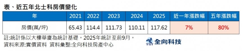 由於北士科基本面好,加上市場強大的上漲預期心理下,觀察市場可發現,近年北士科房市火熱,目前區內新案動輒每坪百萬元以上,根據實價資料顯示,北士科區域大樓房價已連四年平均單價都破百萬,近五年來區域房價從6字頭,直接跳到跳到三位數,五年房價狂漲八成,成為北市房價漲勢最猛的區塊之一。